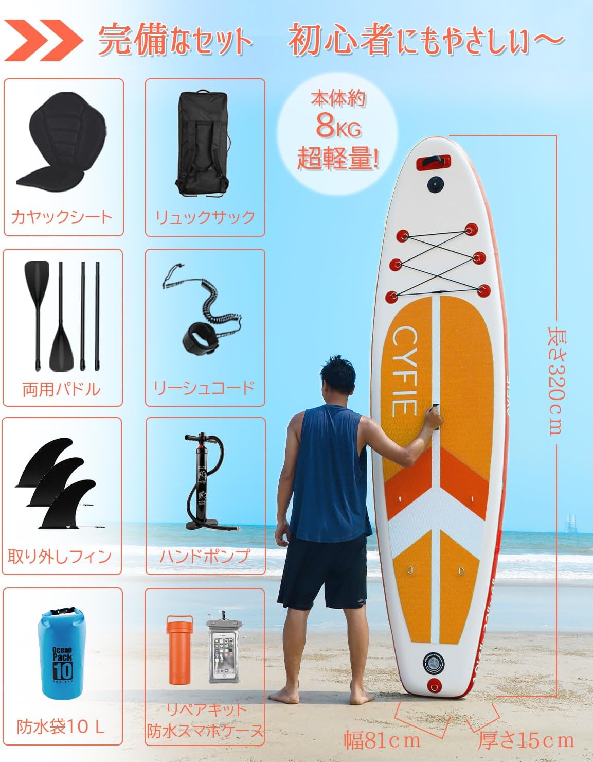 • パッケージの内容✚仕様】:スタンドアップパドルボード本体x1、カヤックシートx1、リュックサックx1、両用パドルx1、リーシュコードx1、フィンx1、ハンドポンプx1、 10L防水袋x1、リペアキットx1(接着剤付属しない)、防水スマホケースx1、日本語取扱説明書x1。仕様:サイズ:320×81×15(cm);重量:約8kg;安全耐荷重:150kg;空気圧:10-15psi;推奨空気圧:12psi。