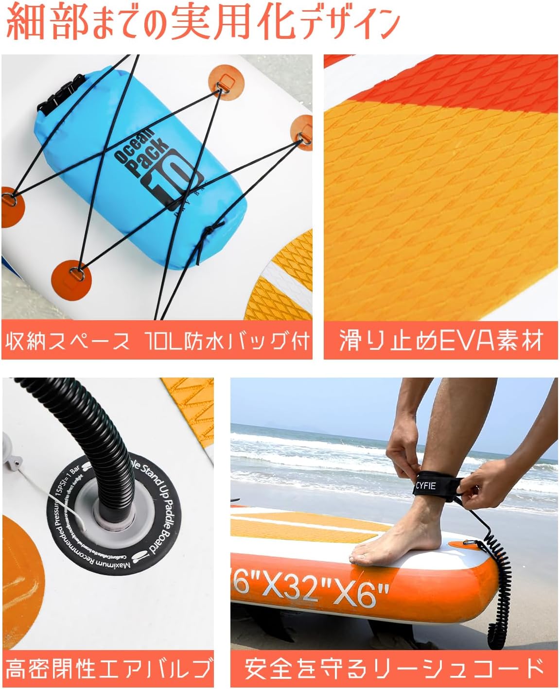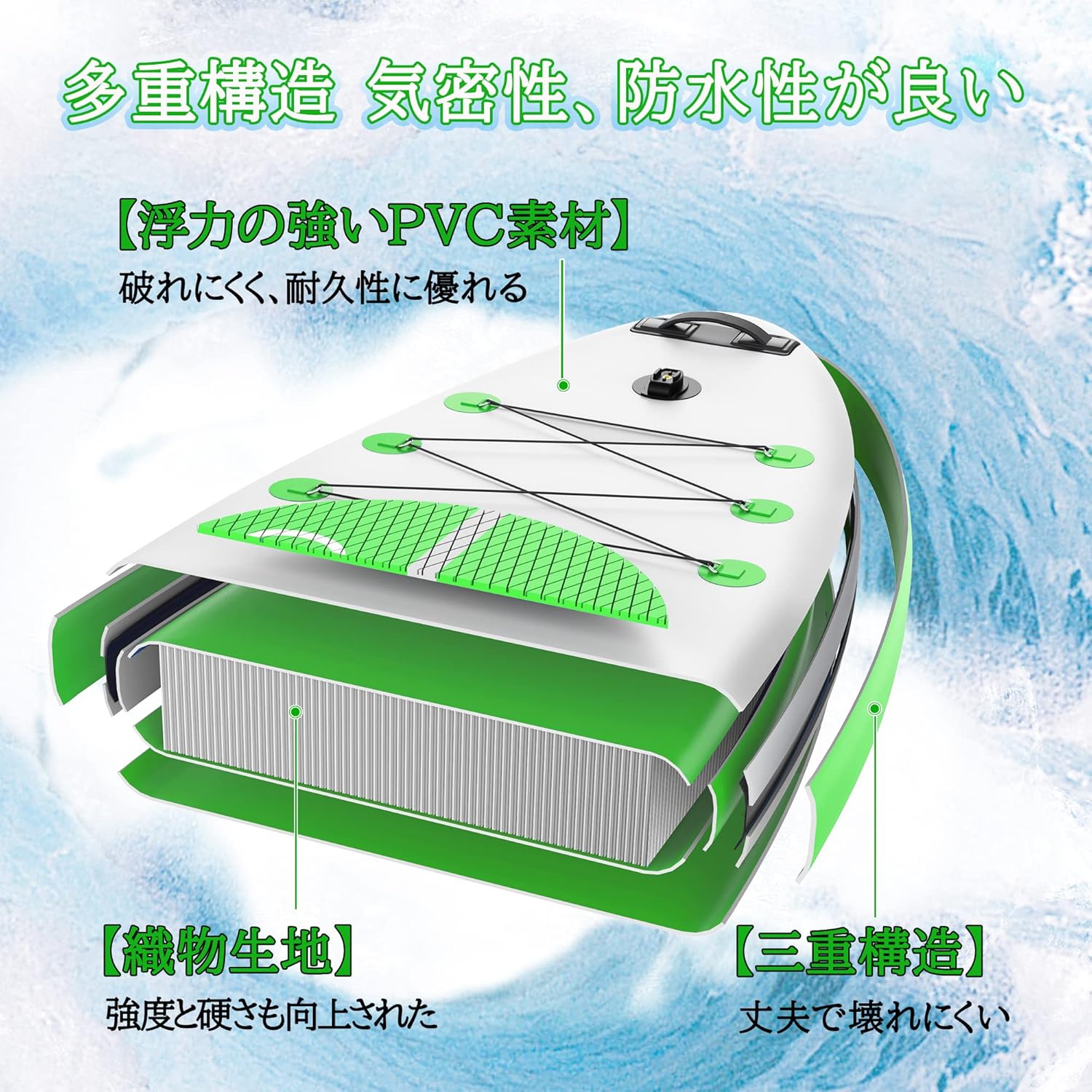• 安全安心なデザイン】●このサップボードの表面には溝があり、グリップ力を高めて、水に濡れしても滑りにくくなります。●先進的な融合技術や3層構造を採用し、密封性にすごく優れ、突然の水漏れ事故が発生しません。●リーシュコードがあり、これを通じてSupとボディを繋げ、万が一水に落ちても、SUPボードに戻ることができます。●sup ボードの前にあるハンドルは必要な時に力のアシストとしてサップに戻れます。