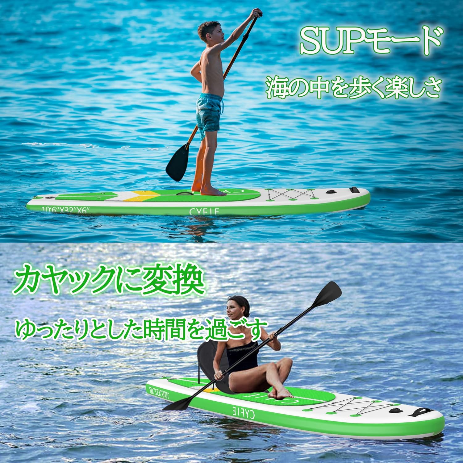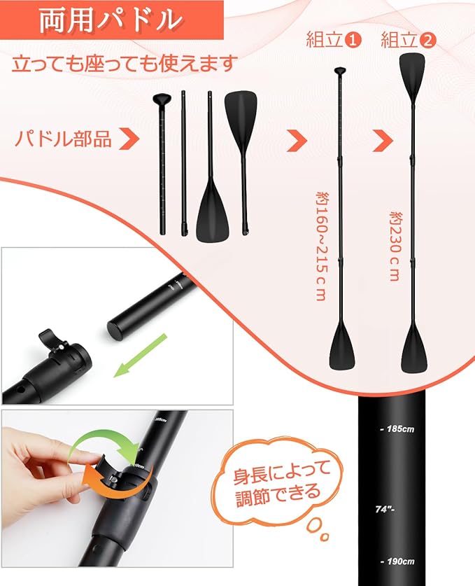 • カヤックとして使用可能:シート✚両用パドル付き】カヤックシート付き、sup サップボードに取り付けるなら、カヤックボードとしてもお使い頂けます。両用パドルも付き、座るなら、パドルはカヤック用に変換可能です。また、パドルは身長によって調節できます。多機能かつ使いやすく、湖はもちろん海でも使用できます。ツーリング、釣り、ヨガなど、幅広い用途にご利用いただけます。