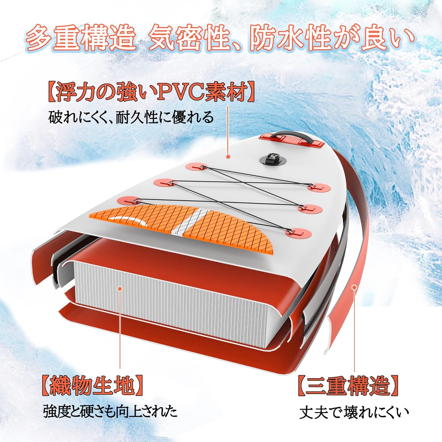 • 品質にこだわり、耐久性がある】このスタンドアップパドルボードは超丈夫なドロップステッチ構造、デュアルフュージョンラミネート高密度PVCや高品質なEVA素材を採用し、大幅に本体の剛性をアップし、強い衝撃や摩擦による破損をほぼ完璧に回避できます。そればかりか、カビやUVを防止でき、優れた耐久性があり、長く使っても傷つけたりことはしない。