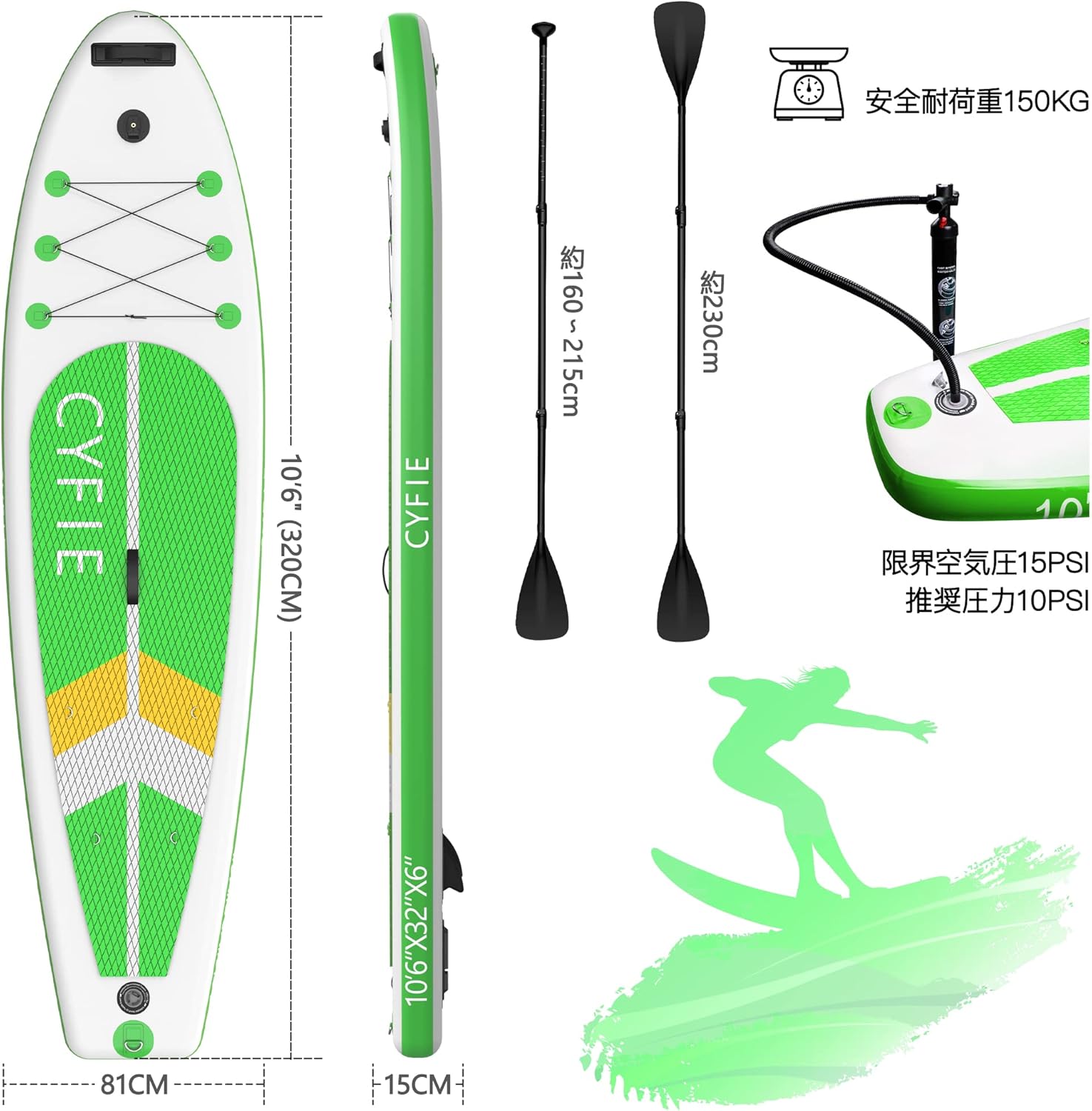 CYFIE サップボード 320cm インフレータブル SUP 耐荷重150kg 初心者向けセット パドル付き