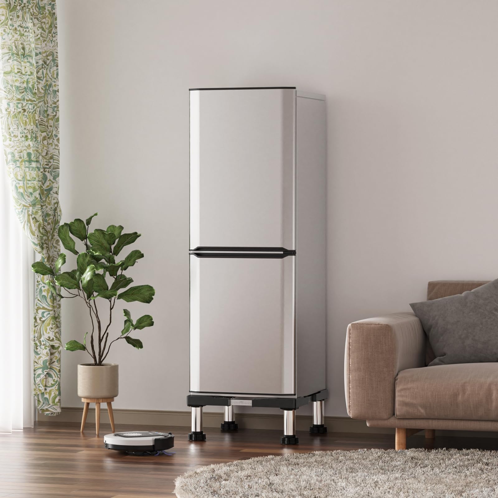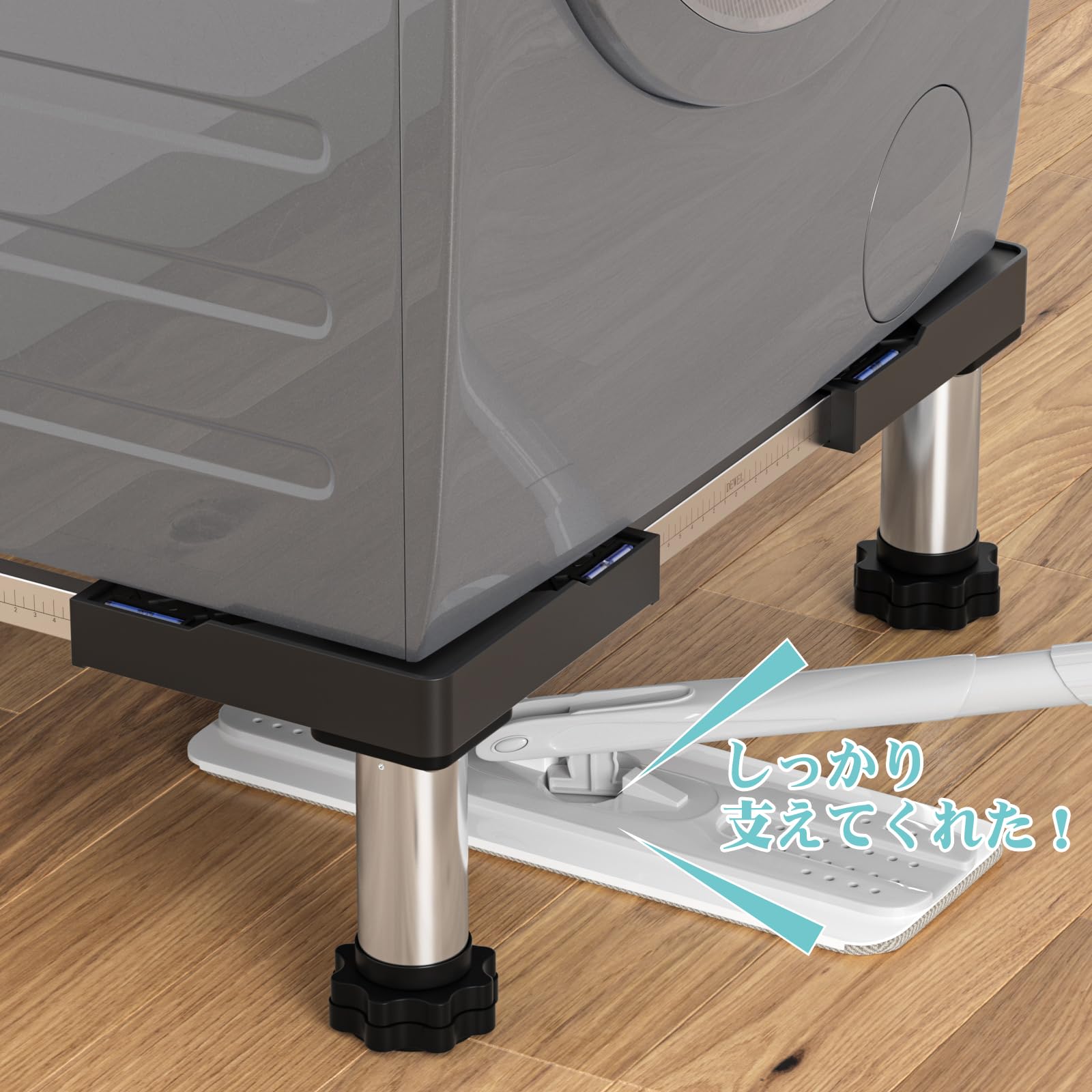 分譲マンション住まいで、縦型からドラム型の洗濯機に買い替え、排水口が塞がってしまうので、かさ上げするために購入しました。洗濯パンの上に、別途購入した防振マットの上に置いています。のせている洗濯機は国内メーカーの10キロ対応のものです。1ヶ月使用していて、洗濯機はちゃんとこの台に乗っていて、なんの問題もないです。下が15cm空いているので、高圧排水管洗浄がくる時も、業者さんがやりやすいのではと思います。下に空間があるために、ホコリも拭けそうです。が、こういう台を洗濯機のメーカーは推奨していないため、強度も不明なので、自分は手を突っ込んで掃除はしない予定。(台を使用して洗濯機が倒れたら補償の対象外)拭き掃除するなら、ワイパーでやります。下の空間が15cmあるから、プラスチックの箱などを入れて掃除道具や洗剤のストックも入れられます。洗濯機が高くなったので、しゃがまずに、洗濯物の出し入れができます!洗濯機が重いので、既に持っている洗濯機の下に置くのは難しいと思います。我が家は買い替えに合わせてこの台を購入してあったので、良かったです。両側が壁のために、業者さんも乗せる時に壁が傷つく場合もある、ということを言われました。(無事に置けましたが)