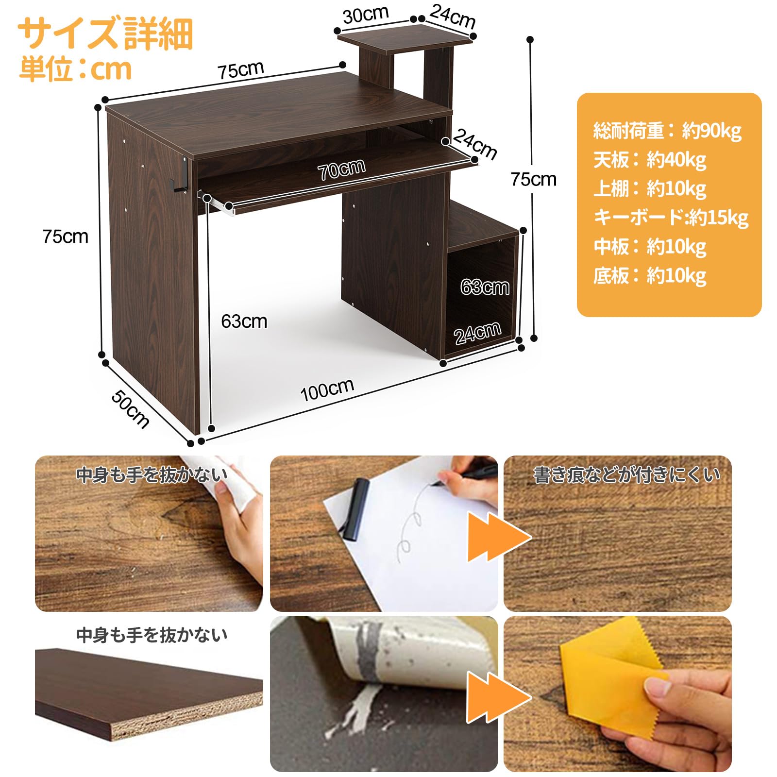 • 商品仕様】●本体サイズ:約幅101×奥行50×高さ87CM ●本体重量:約25KG●材質:パーチクルボード ●お客様組立て品です。●万が一ご購入した商品に初期不良が発生した場合、いつでもお気軽にお問い合わせください。テレワークデスクとしてはもちろん、ゲーミングデスクとしても使用できる棚付きデスクです。