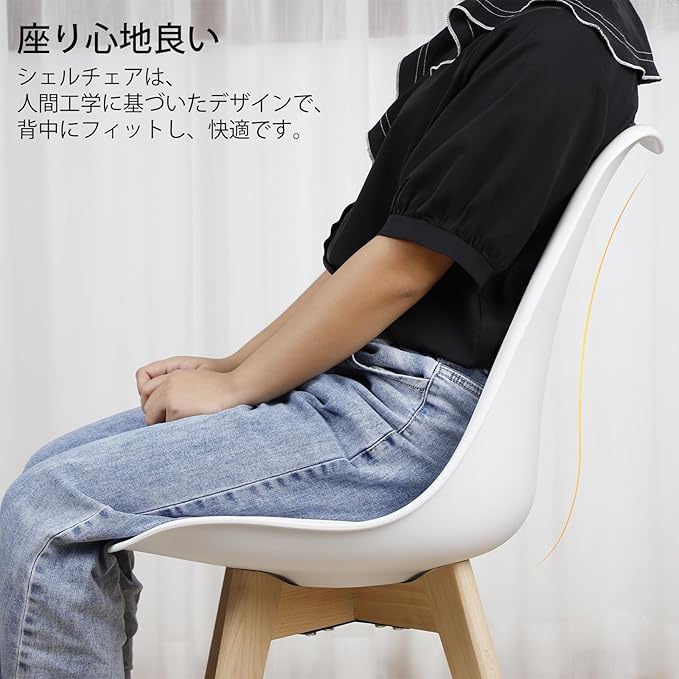 • 美しい曲線がフィット】 背板と座面が一体型の形状となったシェルデザインです。優しい曲線を描いた座面が、体を包み込むようにフィットして、長時間に座っていても疲れにくい構造となっています。