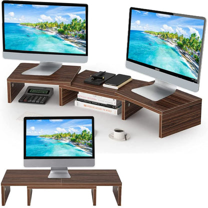 DEWEL デュアルモニタースタンド 木製 折りたたみ式 幅90cm 2台モニター対応 耐荷重40kg 3段ラック 調整可能 組立簡単 ウォルナット
