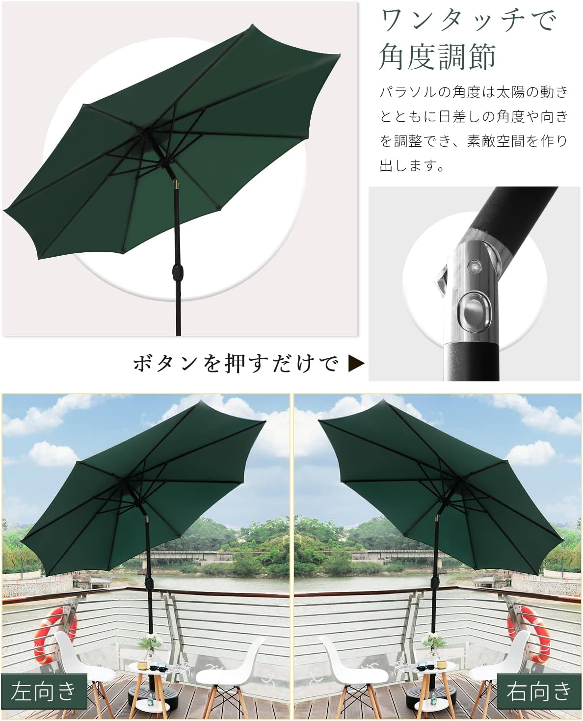 【角度調整で一日中快適に日除け】太陽の位置に合わせてパラソルの角度を左右に自由に調整可能。朝から夕方まで日差しをしっかりカットし、常に快適な日陰スペースを確保します。