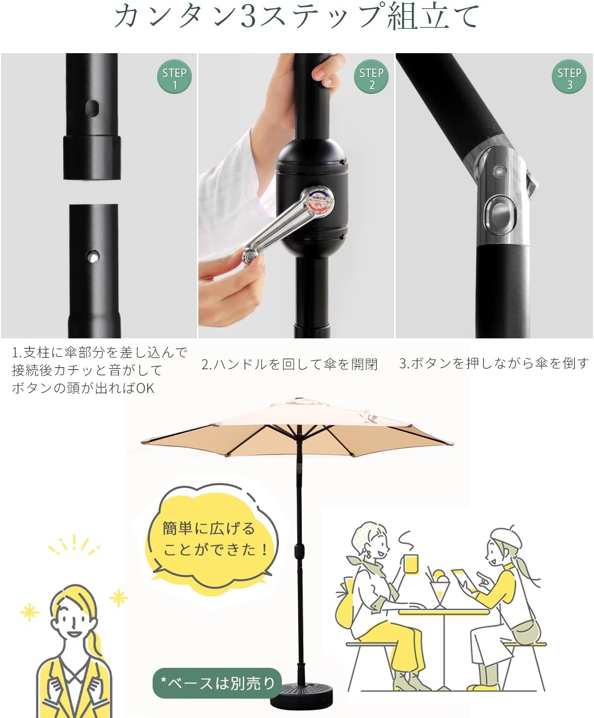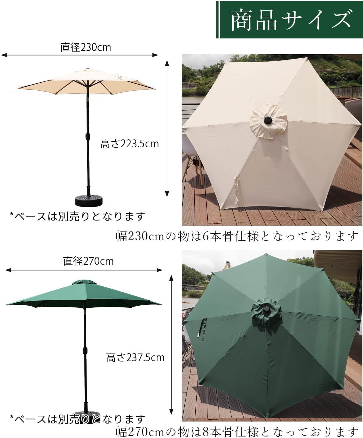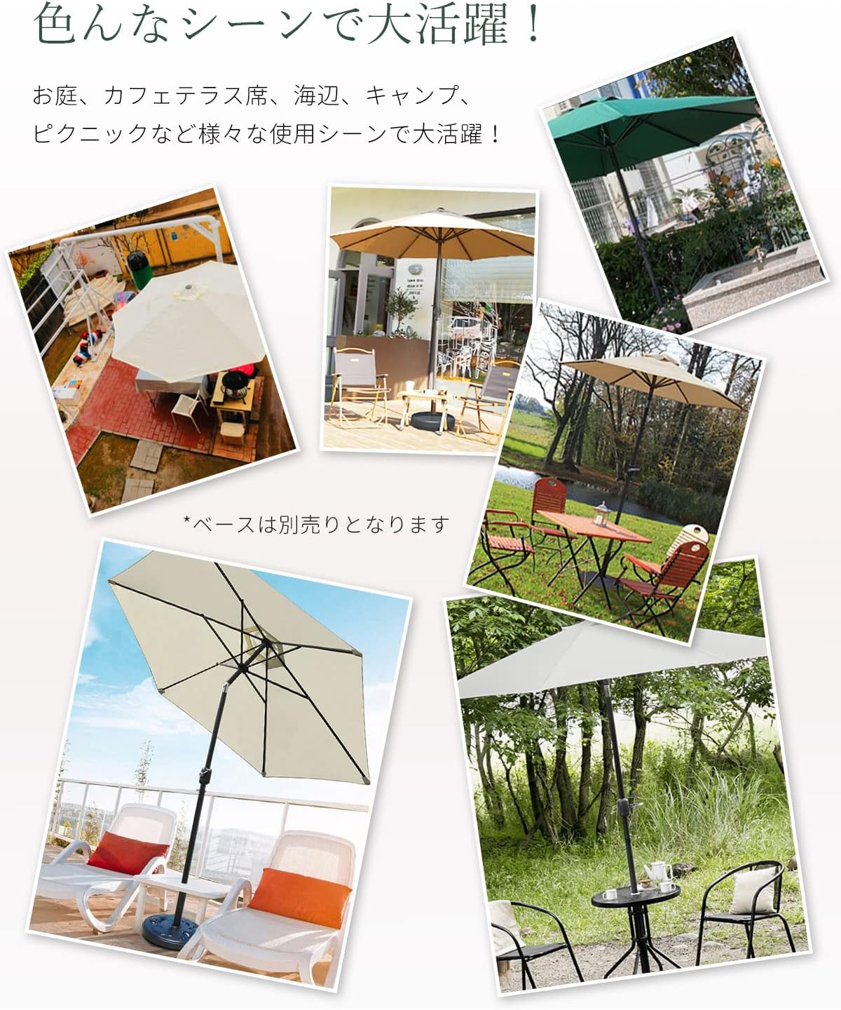 - 「パラソルのみ」とは、付属品やスタンド(ベース)が含まれず、パラソル本体だけを指します。購入の際は、必要に応じて専用のスタンドやベースを別途ご用意ください。