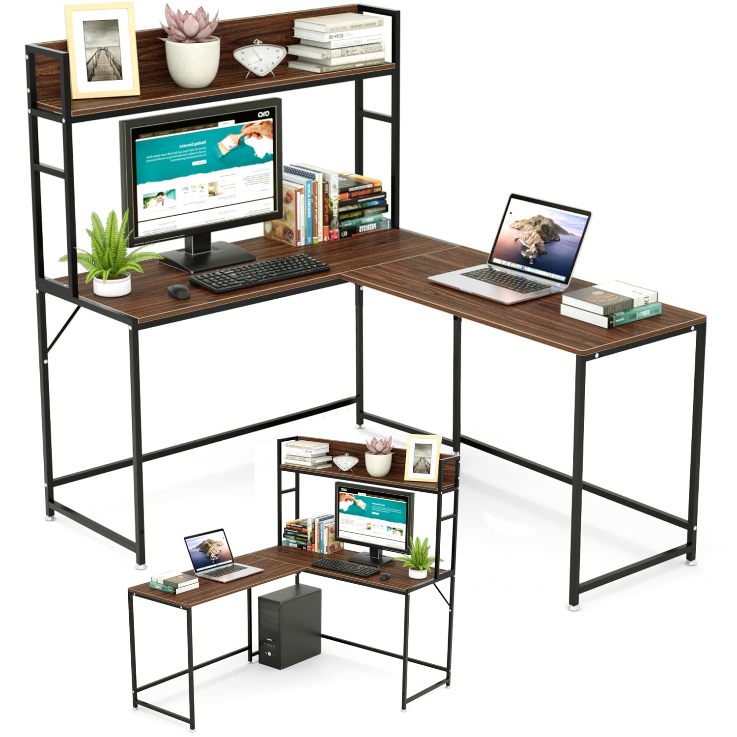 DEWEL L字型パソコンデスク 150+110cm 収納ラック付き モニターアーム対応 足元フリー設計 木目柄 テレワーク対応
