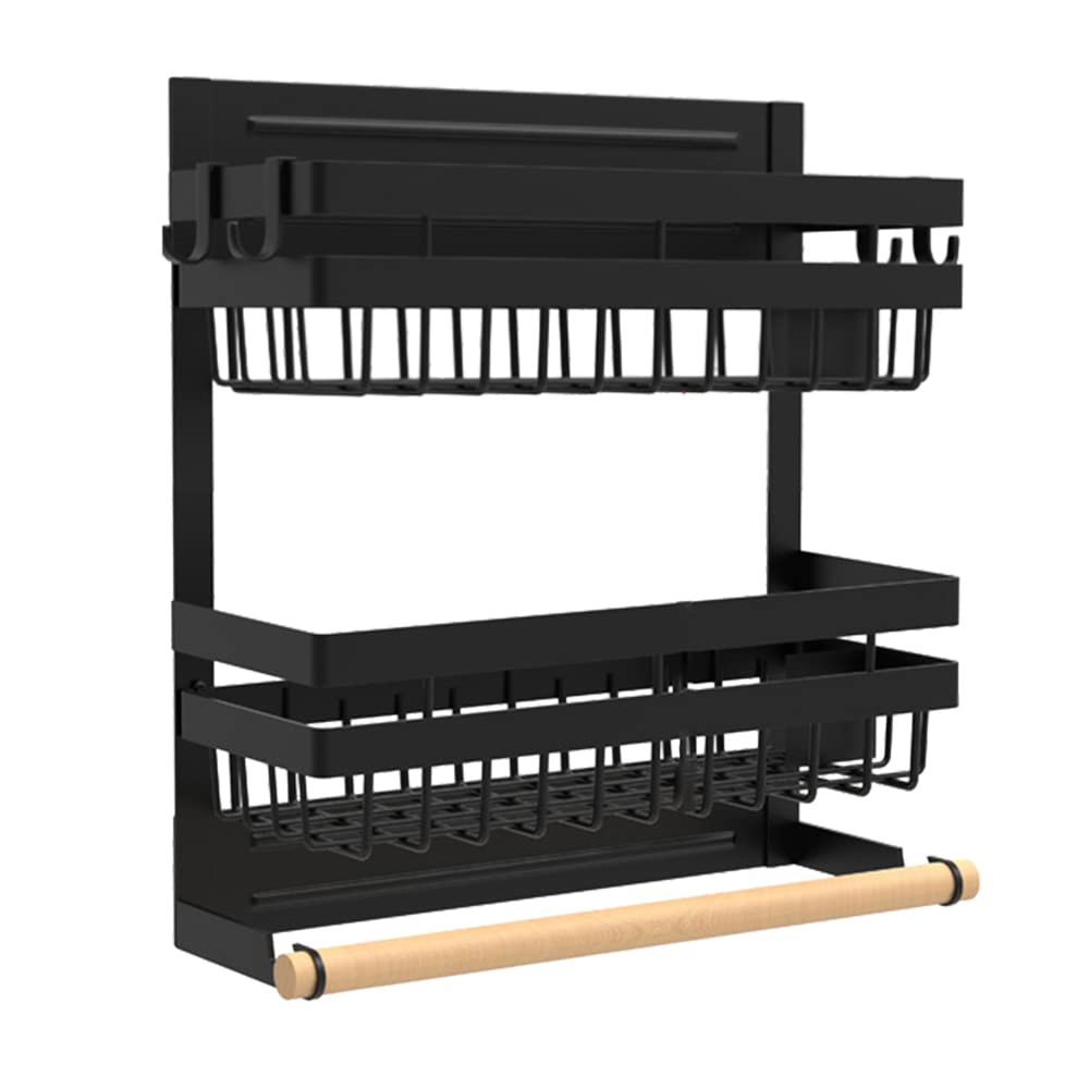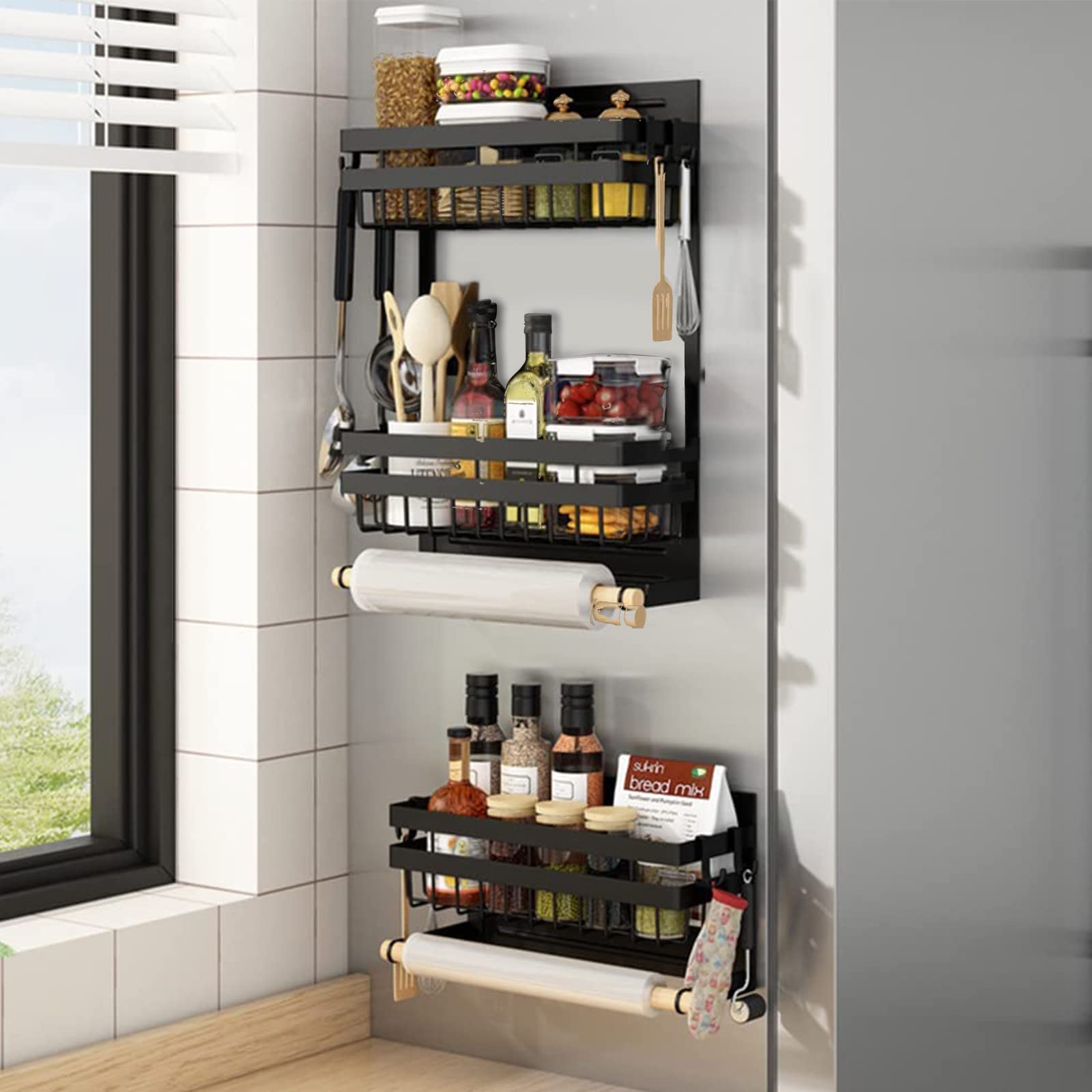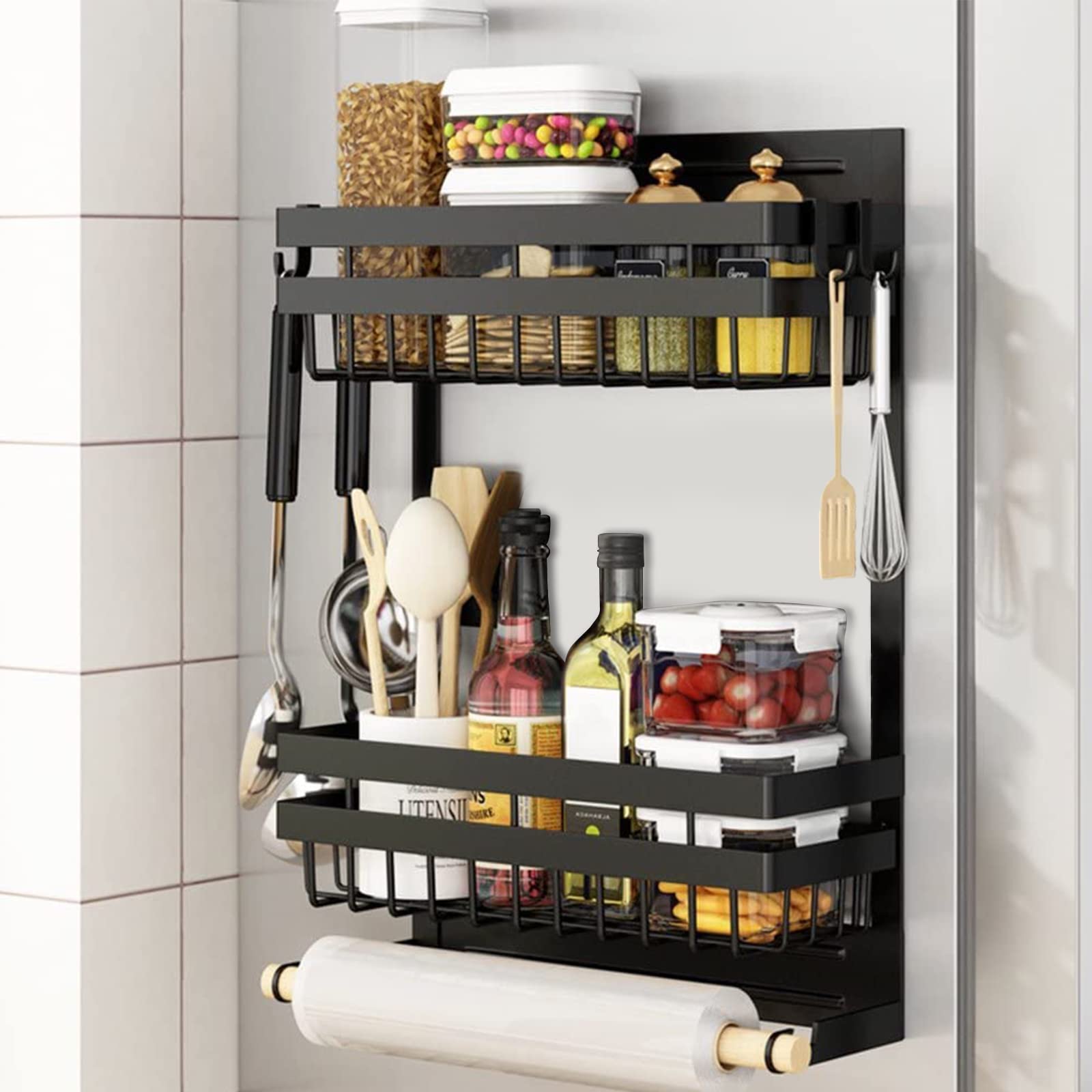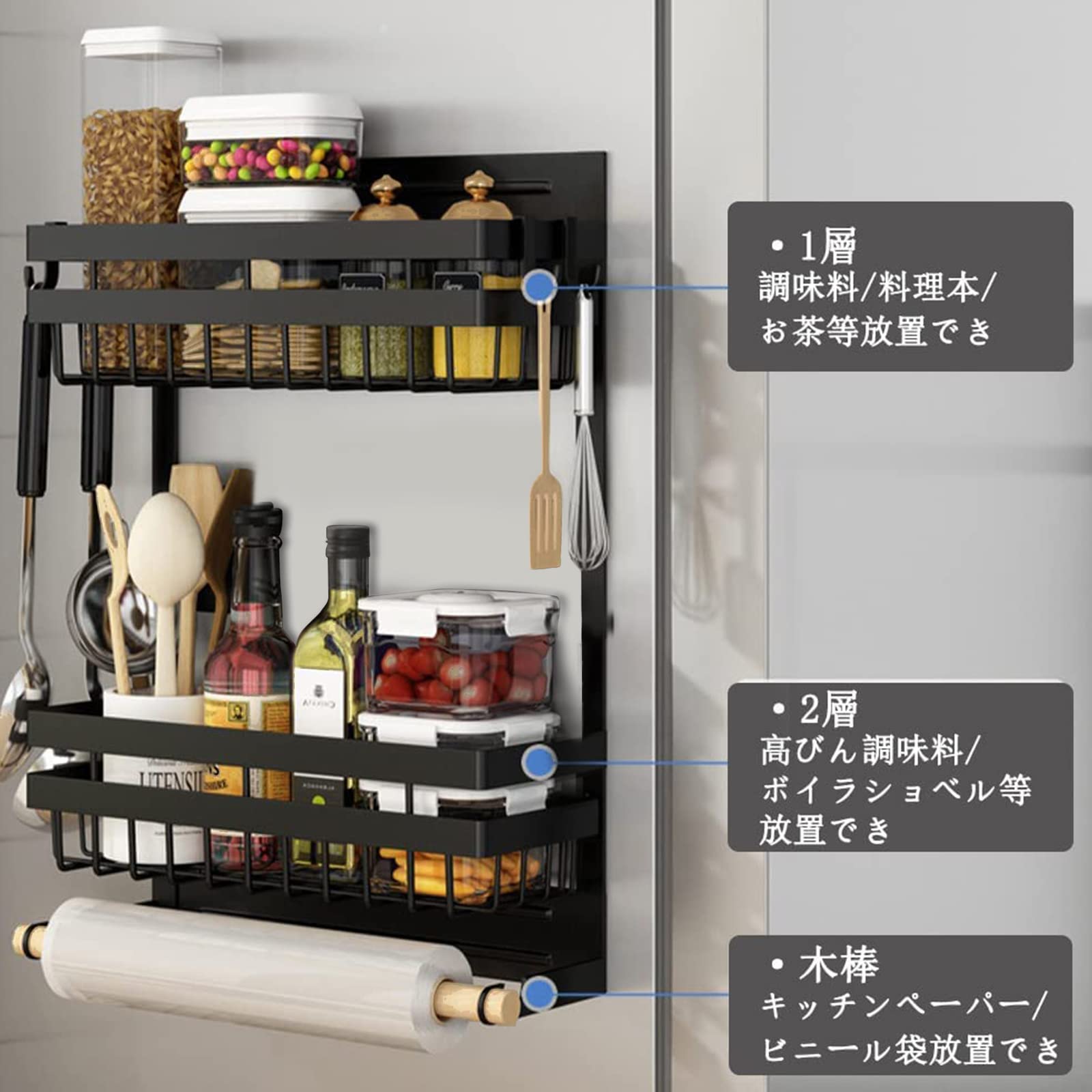 • 多機能収納ラック】冷蔵庫・電子レンジなどのサイドに設置する場合は、スパイスジャー、調味料ボトル、ラップ、キッチンペーパーなどを収納できます。そして、製品には2つの取り外し可能な可動フックが付属して、スクープ、泡立て器、タオル、はさみやその他の小さなキッチン用品を掛けることができます。洗濯機の側面に磁気で取り付ける場合は、洗濯洗、柔軟剤、漂白剤などを置きます。