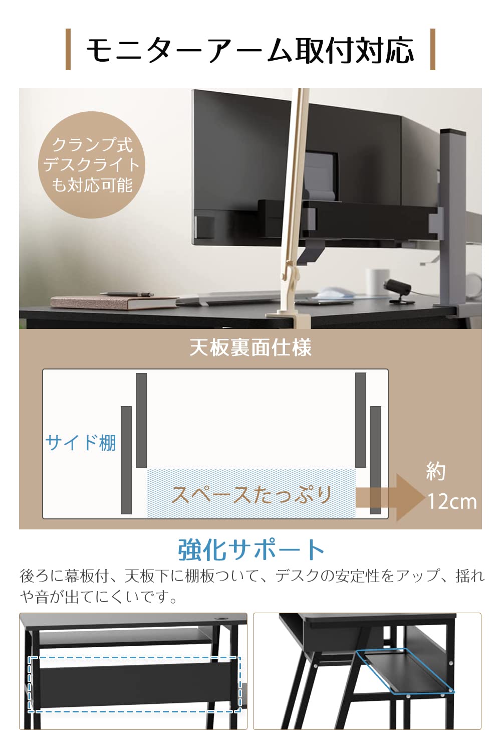 • 作業がはかどる広々デスク&モニターアーム対応可能】►使いやすい横幅100cmの天板を採用して、パソコンを使いながら書類を広げる場合でもゆったりと使用出来て、書類業務とパソコンを同時に行うことができます。►後ろにモニターアームを搭載して使用することができて、自分好みのPC環境を作りやすいほか、デスク上のスペースを広々と使えます。