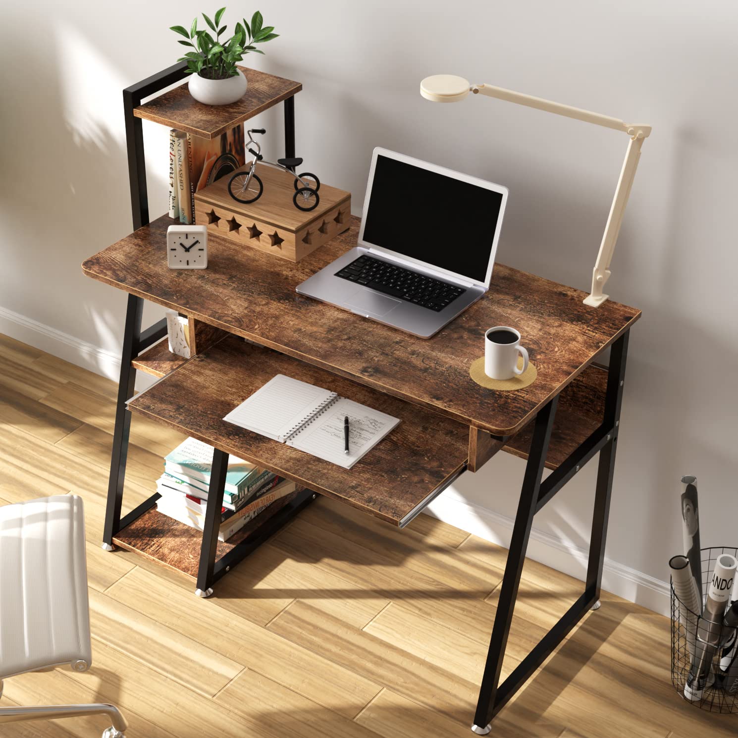 DEWEL パソコンデスク キーボードスライダー付 3段収納ラック モニターアーム対応 メラミン加工 木製 省スペース 在宅勤務対応