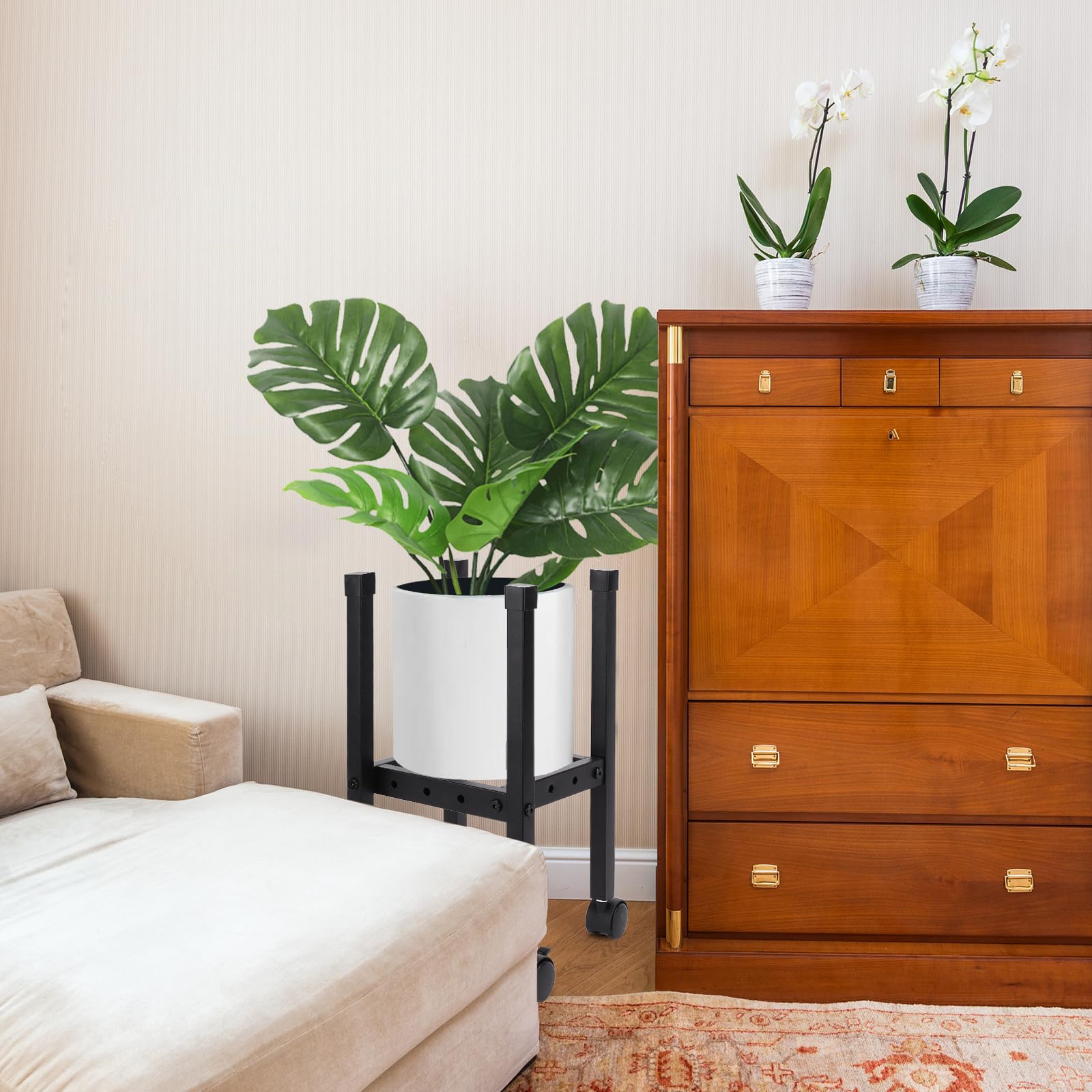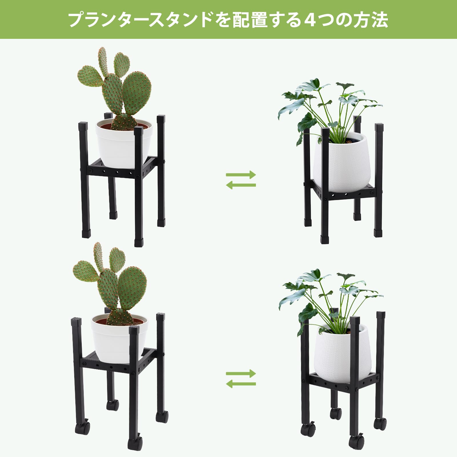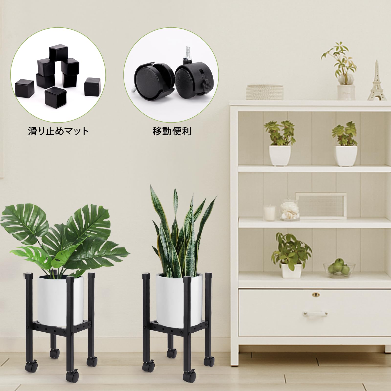 • 移動に便利なキャスター付き】 本製品には、移動に便利なキャスター付きとなっております。床を傷つけることなく安心して植木鉢や花瓶、大型植物プランターなどを簡単に移動できます。360°回転するので移動もスムーズです!また、2つキャスターはストッパー付きがあるのでお子様やペットのいるご家庭でも心配ありません。