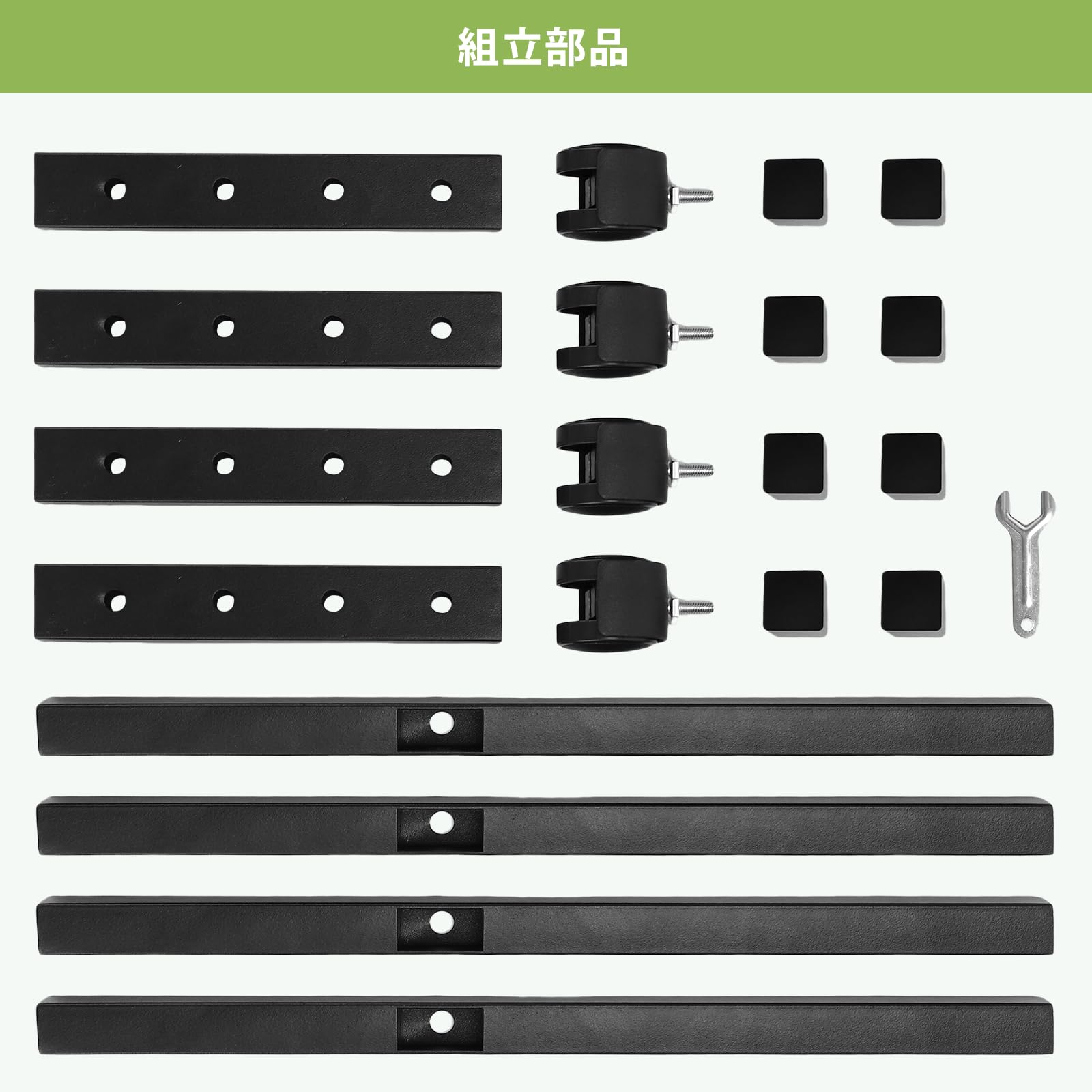 • パッケージ内容】短いパイプ*4、長いパイプ*4、20mmネジ*4、30mmネジ*4、足カバー*8、キャスター(ストッパー付き)*2、キャスター(ストッパー付きない)*2、スパナ*1、六角レンチ*1、説明書*1。材質:鉄製。