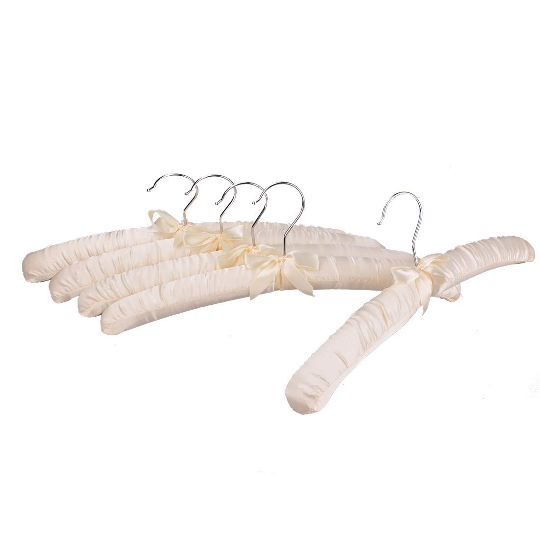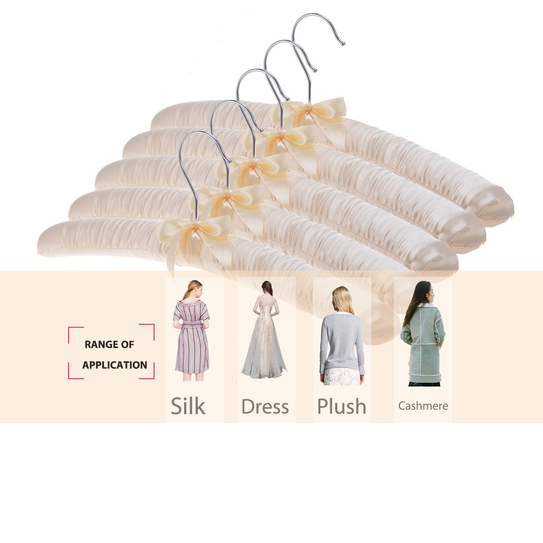 DEWEL サテンスポンジハンガー 5本セット ベージュ 布製 リボン付き クローゼット・客間用