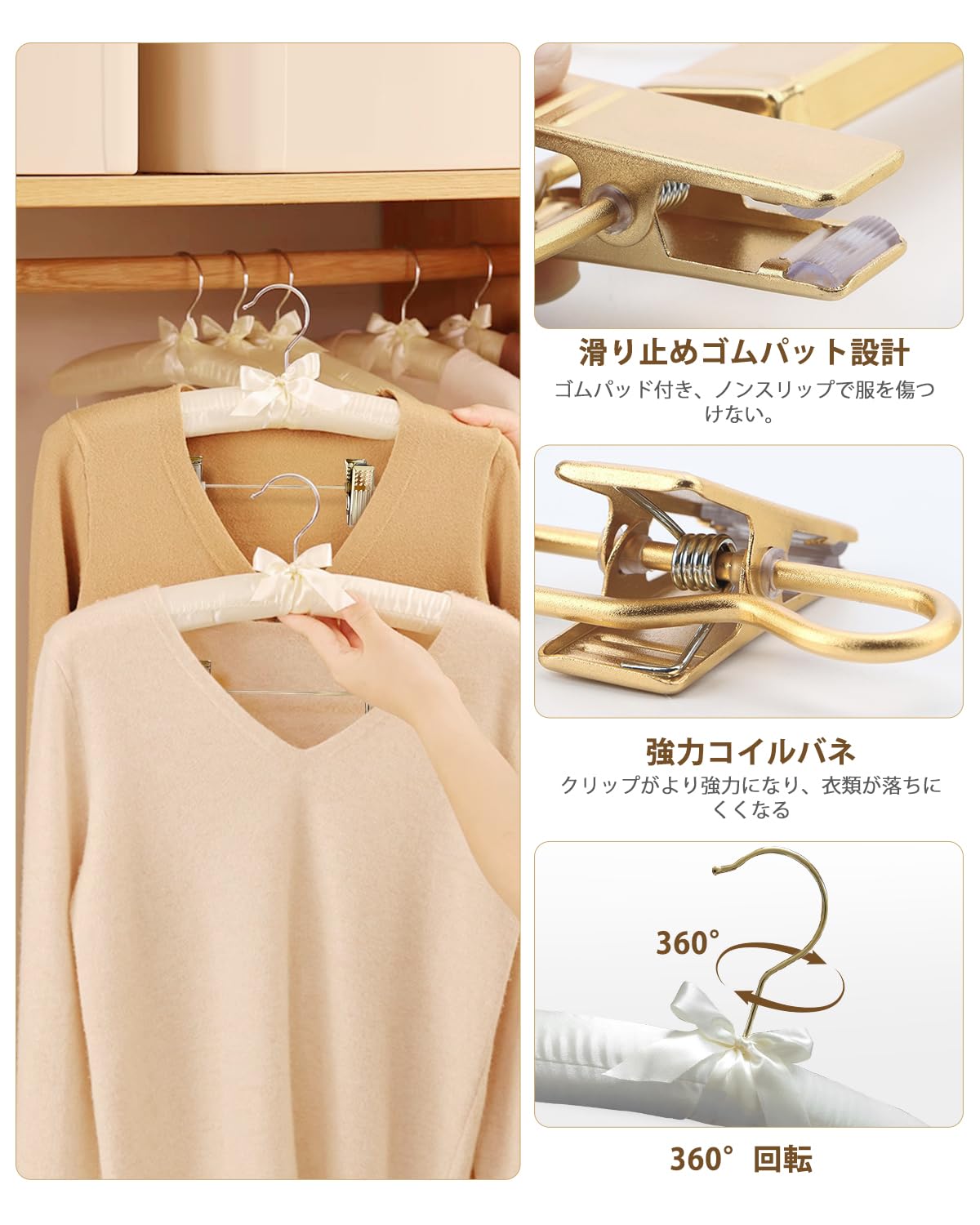 • 360度回転】本タイプのクリップの色は金色です。このハンガーのフックは360度回転することができます。