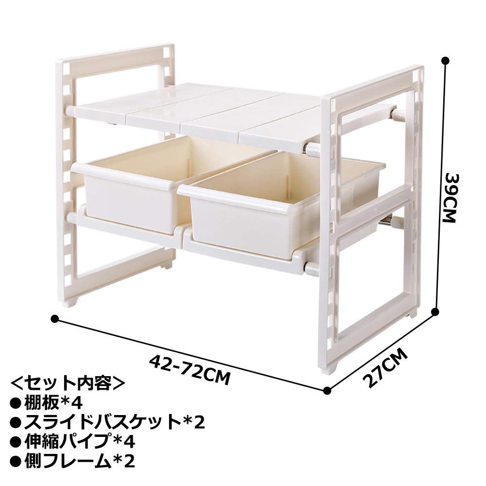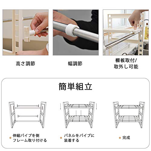 • 2段式ラック】①幅は42-72cm伸縮可能 ②上下段の棚の高さは11段階調節できる ③各棚板も左右にスライドすることができる。装着も取外しも自由に。 日本語組立説明書付属、ネジを使わず誰でも簡単に組み立て、安定感もバツグン。