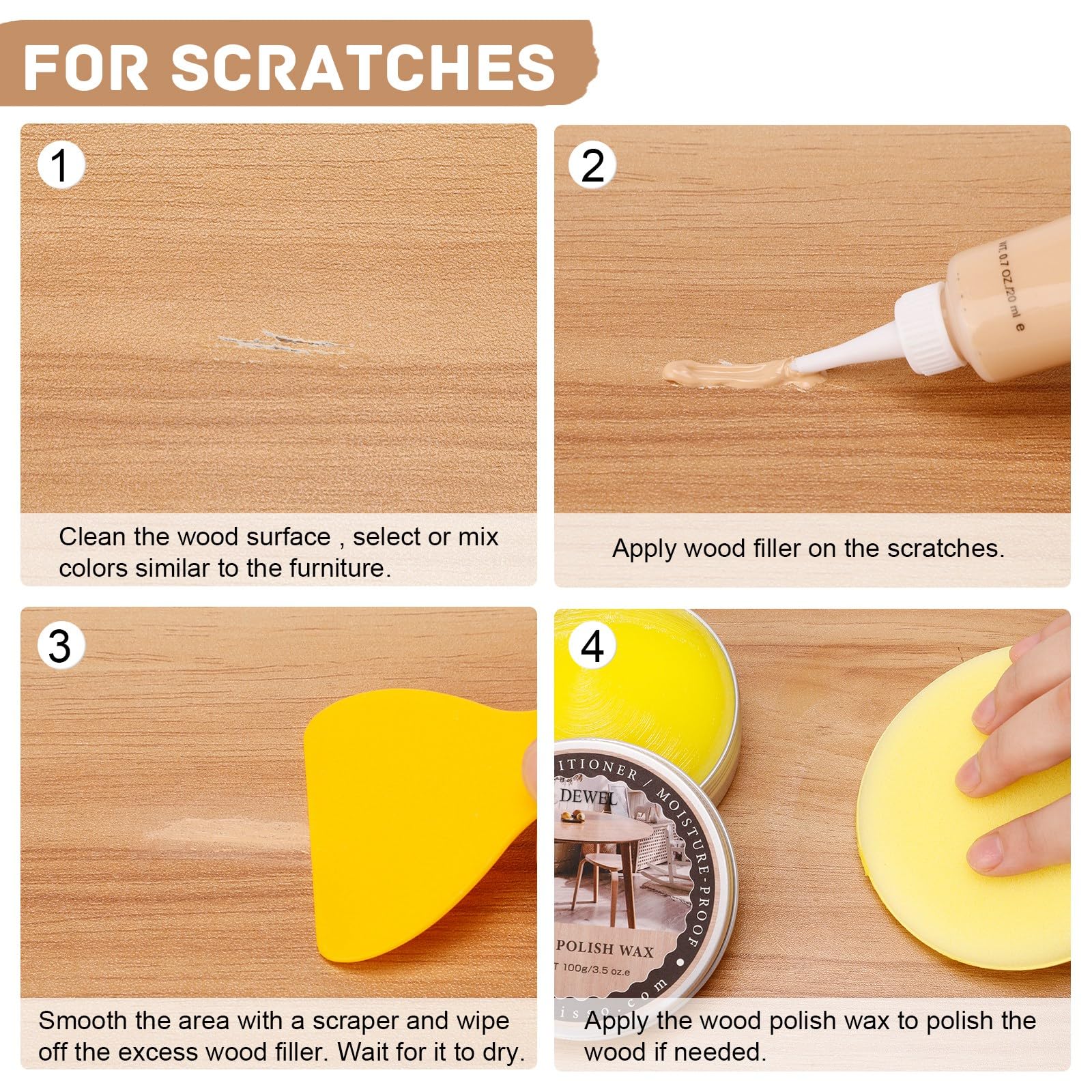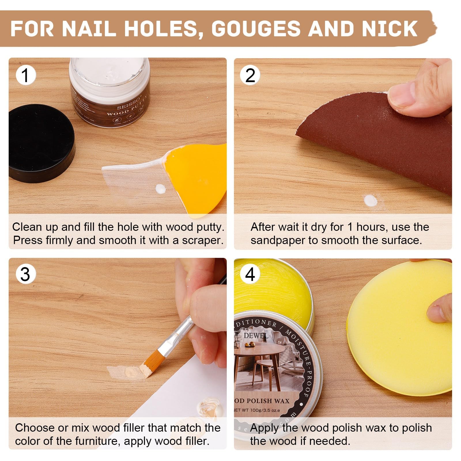 • 簡単操作】①穴をきれいにして木工用パテで埋めます。スパチュラでしっかりと押して滑らかにします。②赤い砂紙で表面を滑らかにします。③1時間後、家具の色に近い補修クリームで修復します。(パレットを使って適切な色を混ぜることができます。)④乾燥後、木材を維持するために必要に応じて木蝋油を塗ります。大部分の木製家具に対応します、補修用具も完備、補修作業もとても簡単です。