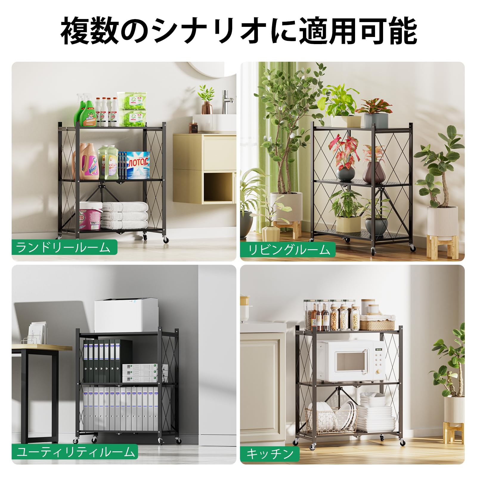 • 🏠 【360°回転式キャスター付き】360°回転キャスター付きのラックはさまざまな方向に簡単に移動でき、位置を調整する必要がある場合に適しています。装備された停止装置により安定性が向上し、使用中の偶発的な動きを回避できるため、オフィス、倉庫、家庭など、さまざまなシナリオに適しています。