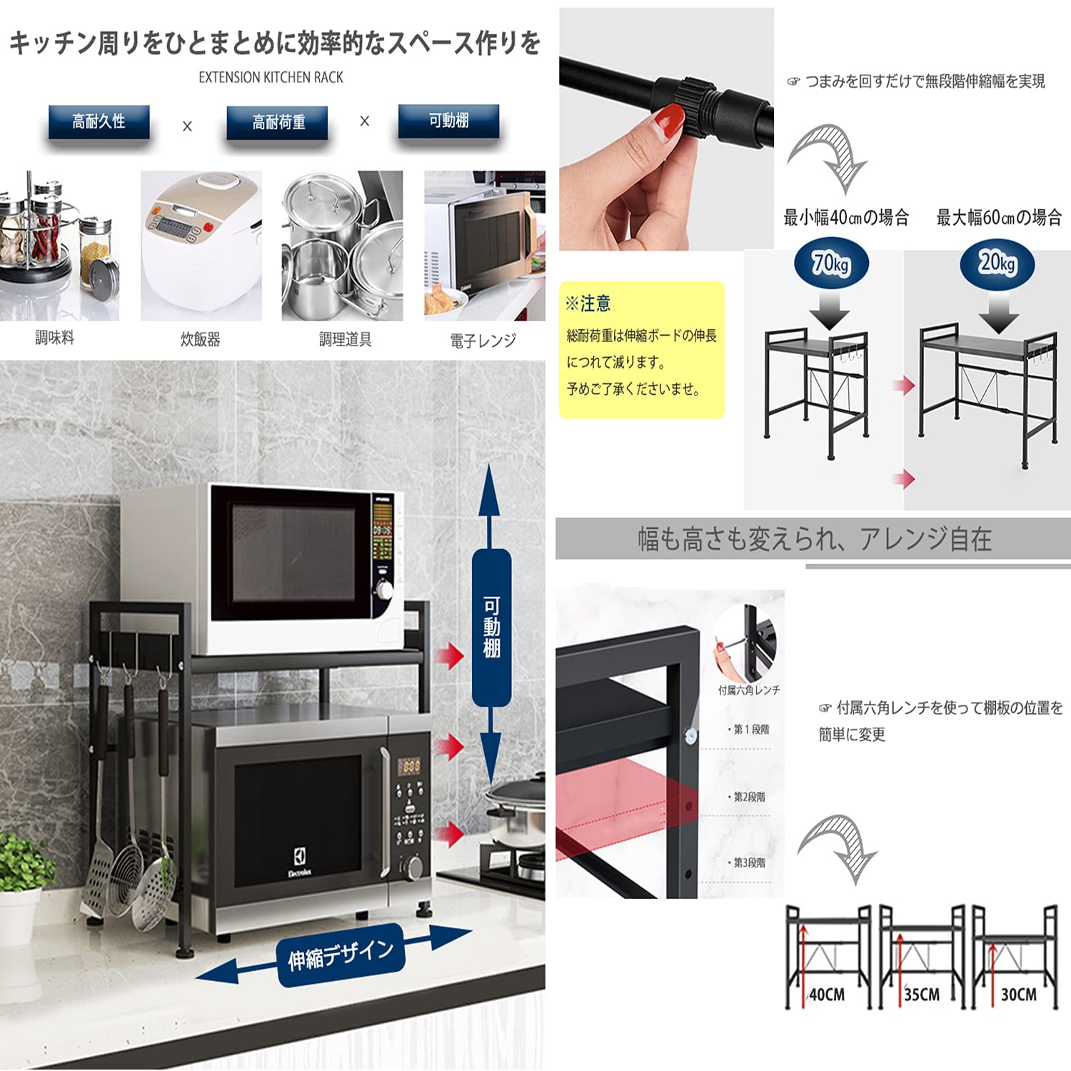 • ✅【幅も高さも変えられ、アレンジ自在】幅40~60cmで無段階調整できる伸縮デザイン。電子レンジのサイズや、収纳物、置く場所の広さなどに合わせて調整していただけます。棚板は約5cm間隔で3段階で高さ調節が可能。収納する物の高さに合わせてお使いいただけます。