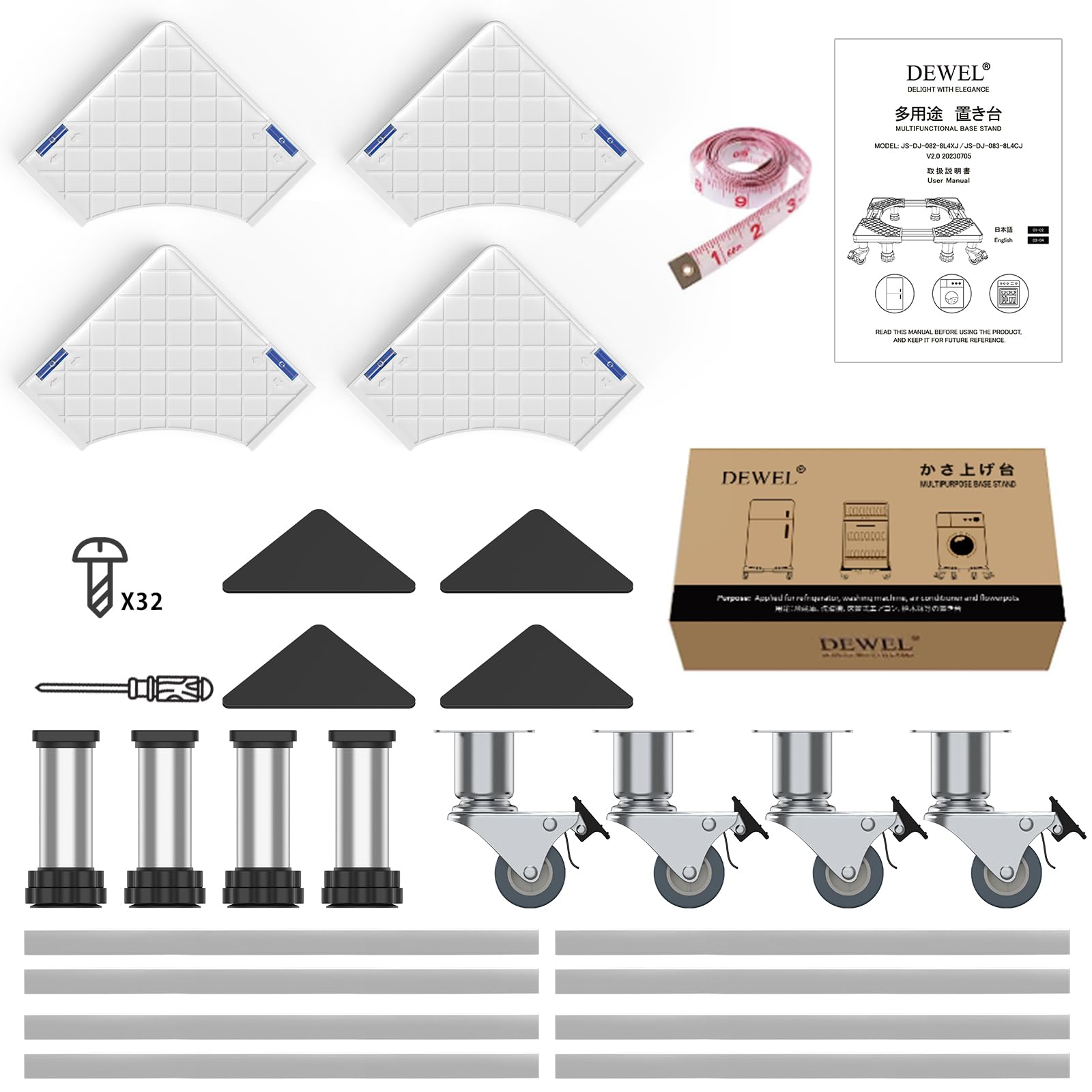 • 寸法】細いジャッキ(直径5cm)(10~11.5cm)4本、高くなったキャスター(11.3cm) 4本、二口型パネル(厚さ3cm)4個