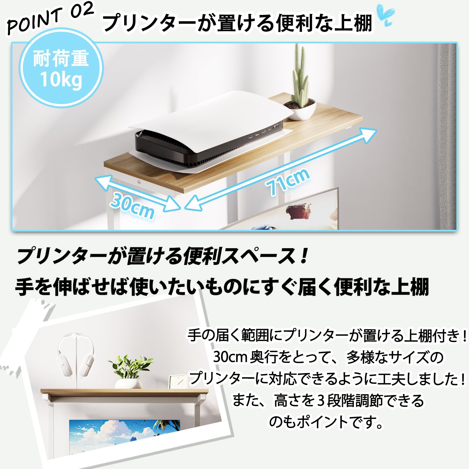 • 縦の空間を有効活用】★上棚:上棚スペースにはインクジェットプリンタなどのパソコン周辺機器を置くことができます。体格やモニタの高さに合わせて、7センチ間隔で3段階調節可能です。手を伸ばせば使いたいものにすぐ届く便利な上棚です。★下棚:パソコン本体やルーター、A4フャイルと書類を収納でき、足元のスペースを有効活用できます。